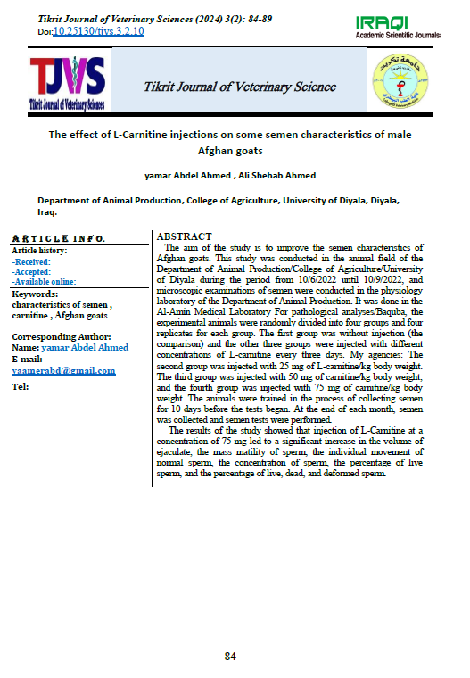 The aim of the study is to improve the semen characteristics of Afghan goats. This study was conducted in the animal field of the Department of Animal Production/College of Agriculture/University of Diyala during the period from 10/6/2022 until 10/9/2022, and microscopic examinations of semen were conducted in the physiology laboratory of the Department of Animal Production. It was done in the Al-Amin Medical Laboratory For pathological analyses/Baquba, the experimental animals were randomly divided into four groups and four replicates for each group. The first group was without injection (the comparison) and the other three groups were injected with different concentrations of L-carnitine every three days. My agencies: The second group was injected with 25 mg of L-carnitine/kg body weight. The third group was injected with 50 mg of carnitine/kg body weight, and the fourth group was injected with 75 mg of carnitine/kg body weight. The animals were trained in the process of collecting semen for 10 days before the tests began. At the end of each month, semen was collected and semen tests were performed.