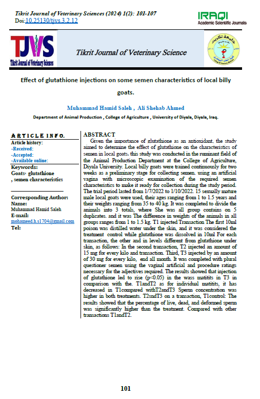 Given the importance of glutathione as an antioxidant, the study aimed to determine the effect of glutathione on the characteristics of semen in local goats. this study was conducted in the ruminant field of the Animal Production Department at the College of Agriculture, Diyala University. Local billy goats were trained continuously for two weeks as a preliminary stage for collecting semen. using an artificial vagina with microscopic examination of the required semen characteristics to make it ready for collection during the study period. The trial period lasted from 1/7/2022 to 1/10/2022. 15 sexually mature male local goats were used, their ages ranging from 1 to 1.5 years and their weights ranging from 35 to 40 kg. It was completed to divide the animals into 3 totals, where She was all group contains on 5 duplicates. and it was The difference in weights of the animals in all groups ranges from 1 to 1.5 kg. T1 injected Transaction The first 10ml poison was distilled water under the skin, and it was considered the treatment control while glutathione was dissolved in 10ml For each transaction, the other and in levels different from glutathione under skin, as follows: In the second transaction, T2 injected an amount of 15 mg for every kilo and transaction. Third, T3 injected by an amount of 30 mg for every kilo, end all month. It was completed with plural questioner semen using the vaginal artificial and procedure ratings necessary for the adjectives required. The results showed that injection of glutathione led to rise (p<0.05) in the wass matitits in T3 in comparison with the. T1andT2 as for individual matitits, it has decreased in T1compared withT2andT3 Sperm concentration was higher in both treatments. T2sndT3 on a transaction, T1control: The results showed that the percentage of live, dead, and deformed sperm was significantly higher than the treatment. Compared with other transactions T1andT2