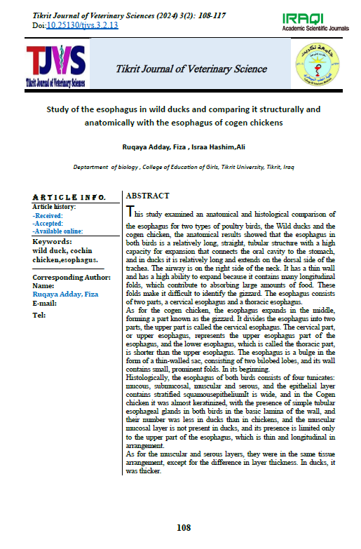 Study of the esophagus in wild ducks and comparing it structurally and anatomically with the esophagus of cogen chickens