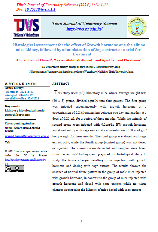 This study used (40) laboratory mice whose average weight was (30 ± 3) grams, divided equally into four groups. The first group was injected subcutaneously with growth hormone at a concentration of 0.2 kilograms/mg between one day and another at a dose of 0.25 ml. for a period of three months. While the animals of second group were injected with 0.2mg/kg BW growth hormone and dosed orally with sage extract at a concentration of 50 mg/kg of body weight for three months. The third group was dosed with sage extract only, while the fourth group (control group) was not dosed or injected. The animals were dissected and samples were taken from the animals' kidneys and prepared for histological study to study the tissue changes resulting from injection with growth hormone and dosing with sage extract. The results showed the absence of normal tissue pattern in the group of male mice injected with growth hormone, in contrast to the group of mice injected with growth hormone and dosed with sage extract, while no tissue changes appeared in the kidneys of mice dosed with sage extract