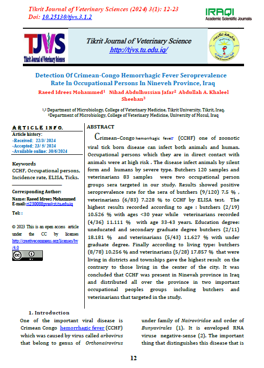 Crimean–Congo hemorrhagic fever (CCHF) one of zoonotic viral tick born disease can infect both animals and human. Occupational persons which they are in direct contact with animals were at high risk . The disease infect animals by silent form and humans by severe type. Butchers 120 samples and veterinarians 83 samples were two occupational person groups sera targeted in our study. Results showed positive seroprevalence rate for the sera of butchers (9/120) 7.5 % , veterinarians (6/83) 7.228 % to CCHF by ELISA test. The highest results recorded according to age : butchers (2/19) 10.526 % with ages <30 year while veterinarians recorded (4/36) 11.111 % with age 33-43 years. Education degree: uneducated and secondary graduate degree butchers (2/11) 18.181 % and veterinarians (5/43) 11.627 % with under graduate degree. Finally according to living type: butchers (8/78) 10.256 % and veterinarians (5/28) 17.857 % that were living in districts and townships gave the highest result on the contrary to those living in the center of the city. It was concluded that CCHF was present in Ninevah province in Iraq and distributed all over the province in two important occupational peoples groups including butchers and veterinarians that targeted in the study