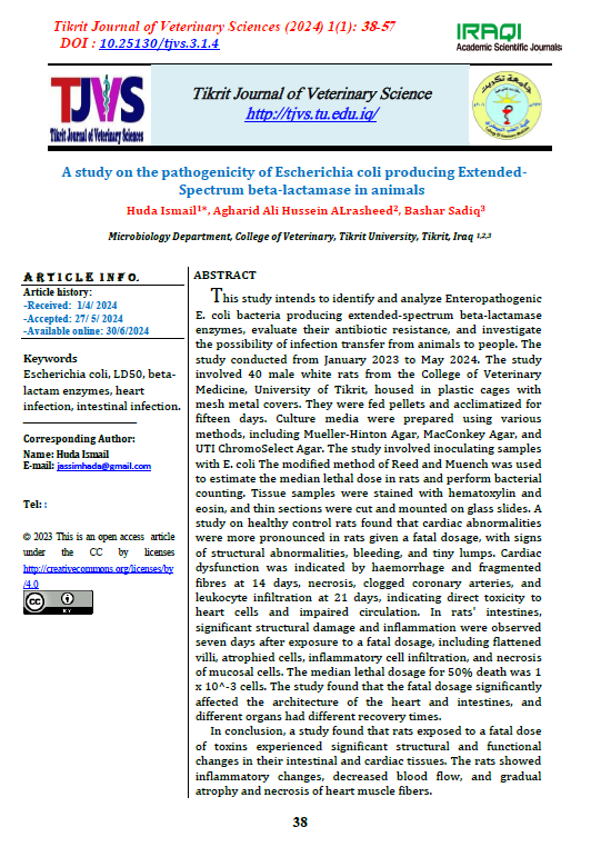 A study on the pathogenicity of Escherichia coli producing Extended-Spectrum beta-lactamase in animals. (2024). Tikrit Journal of Veterinary Science, 3(1), 38-57. https://doi.org/10.25130/tjvs.3.1.4