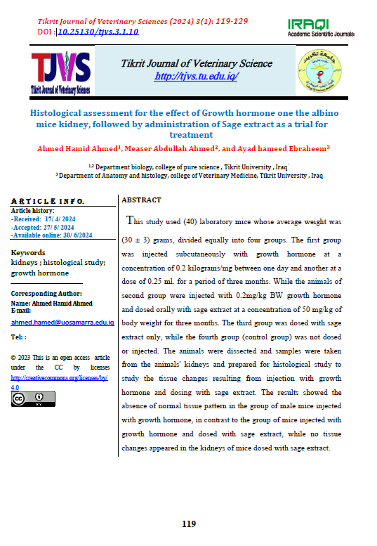 This study used (40) laboratory mice whose average weight was (30 ± 3) grams, divided equally into four groups. The first group was injected subcutaneously with growth hormone at a concentration of 0.2 kilograms/mg between one day and another at a dose of 0.25 ml. for a period of three months. While the animals of second group were injected with 0.2mg/kg BW growth hormone and dosed orally with sage extract at a concentration of 50 mg/kg of body weight for three months. The third group was dosed with sage extract only, while the fourth group (control group) was not dosed or injected. The animals were dissected and samples were taken from the animals' kidneys and prepared for histological study to study the tissue changes resulting from injection with growth hormone and dosing with sage extract. The results showed the absence of normal tissue pattern in the group of male mice injected with growth hormone, in contrast to the group of mice injected with growth hormone and dosed with sage extract, while no tissue changes appeared in the kidneys of mice dosed with sage extract.
