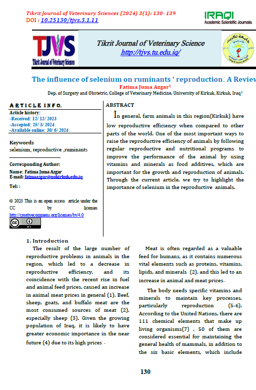 The influence of selenium on ruminants ’ reproduction :A Review. (2024). Tikrit Journal of Veterinary Science, 3(1), 130-139. https://doi.org/10.25130/tjvs.3.1.11