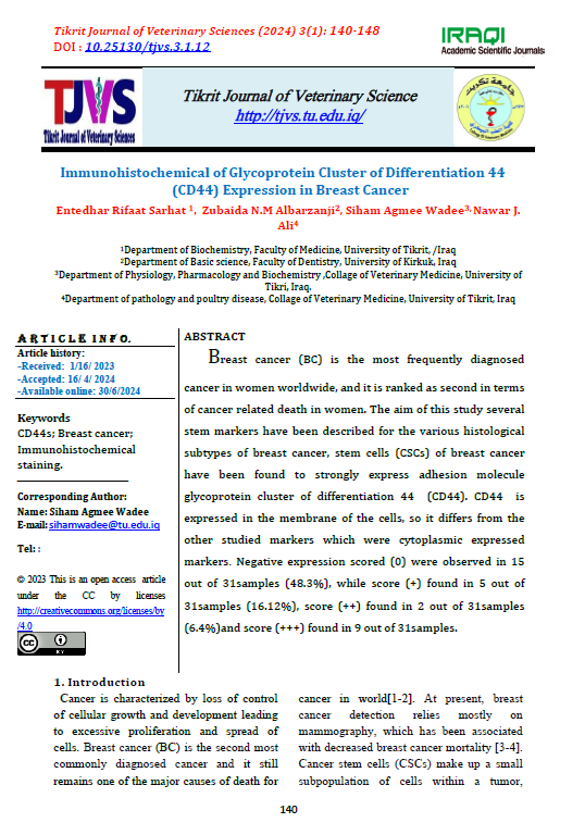 Breast cancer (BC) is the most frequently diagnosed cancer in women worldwide, and it is ranked as second in terms of cancer related death in women. The aim of this study several stem markers have been described for the various histological subtypes of breast cancer, stem cells (CSCs) of breast cancer have been found to strongly express adhesion molecule glycoprotein cluster of differentiation 44 (CD44). CD44 is expressed in the membrane of the cells, so it differs from the other studied markers which were cytoplasmic expressed markers. Negative expression scored (0) were observed in 15 out of 31samples (48.3%), while score (+) found in 5 out of 31samples (16.12%), score (++) found in 2 out of 31samples (6.4%)and score (+++) found in 9 out of 31samples.