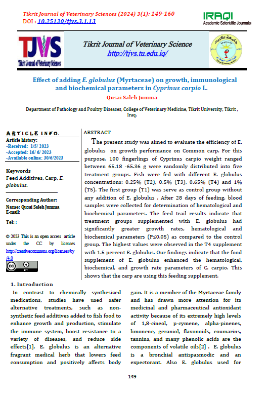 The present study was aimed to evaluate the efficiency of E. globulus on growth performance on Common carp. For this purpose, 100 fingerlings of Cyprinus carpio weight ranged between 65.18 -65.36 g were randomly distributed into five treatment groups. Fish were fed with different E. globulus concentrations: 0.25% (T2), 0.5% (T3), 0.65% (T4) and 1% (T5). The first group (T1) was serve as control group without any addition of E. globulus . After 28 days of feeding, blood samples were collected for determination of hematological and biochemical parameters. The feed trail results indicate that treatment groups supplemented with E. globulus had significantly greater growth rates, hematological and biochemical parameters (P≤0.05) as compared to the control group. The highest values were observed in the T4 supplement with 1.5 percent E. globulus. Our findings indicate that the food supplement of E. globulus enhanced the hematological, biochemical, and growth rate parameters of C. carpio. This shows that the carp are using this feeding supplement.